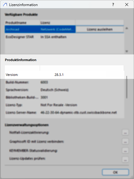 Starten Sie nach erfolgreicher Update-Installation ArchiCAD 28. Wählen Sie im Menü Hilfe den Befehl Lizenzinformationen... an. Im neuen Fenster sollte nun unter Version die Zahl 28.3.1 angezeigt werden.