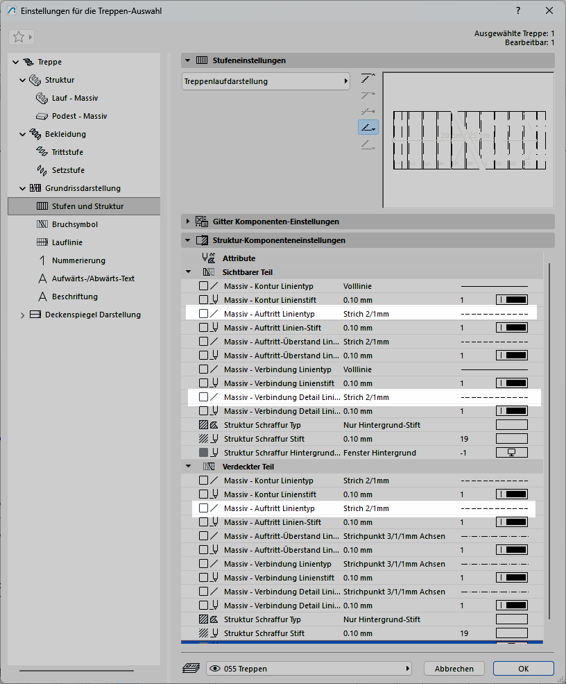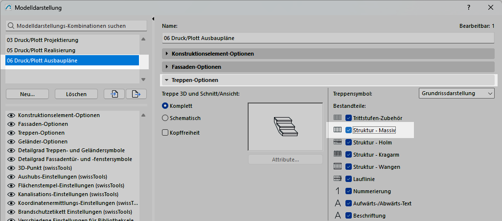 • In der Modelldarstellung schalten Sie unter Treppen-Optionen die Struktur - Massiv ein. Damit wird die Struktur im Grundriss grundsätzlich dargestellt.