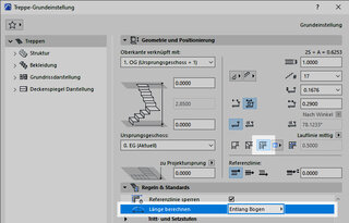 Mit der Lauflinienlängen-Berechnung Entlang Bogen oder Entlang Sehne kann die Referenzlinie gesperrt werden. Diese Funktion hat lediglich Auswirkungen auf die Grundeinstellung von neuen Treppen und nicht auf schon platzierte Treppen.
