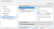 Mit Doppelklick auf das Treppen-Werkzeug gelangen Sie in die Grundeinstellung. In der Favoritenliste finden Sie verschiedenste Treppentypen, welche Sie als Grundeinstellung verwenden können. Die wichtigsten Einstellungen werden folgend erläutert: