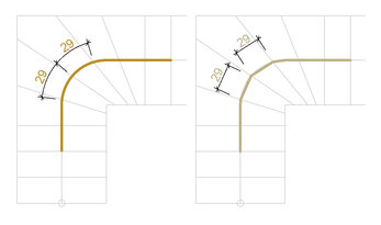 Die Länge der Lauflinie einer Treppe wird beeinflusst von der Berechnungsart in einer Treppenwendung. Die Lauflinienlänge wird kürzer, wenn sie entlang des Bogens berechnet, bzw. länger, wenn sie entlang der Sehne berechnet wird.