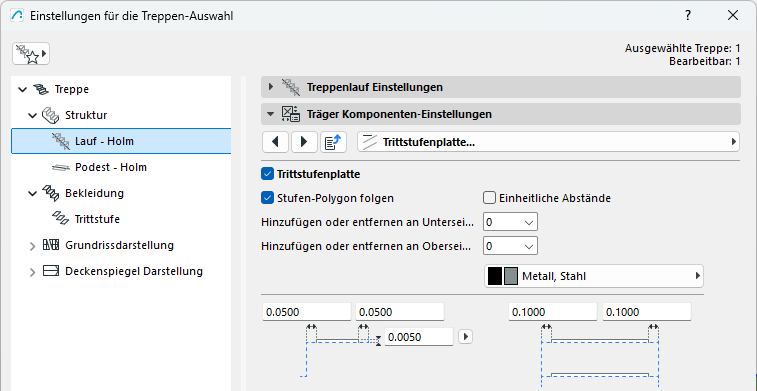 • Anschliessend können Sie die Einstellungen von nur einer Treppenstruktur öffnen (Taste T) und die Struktur anpassen.
