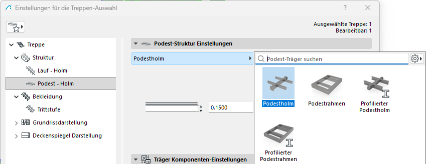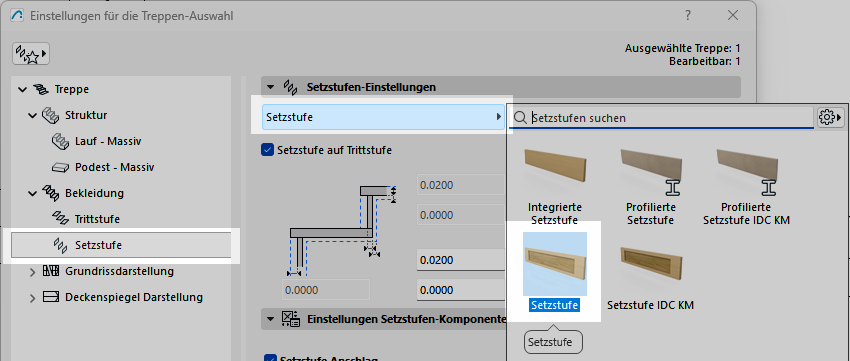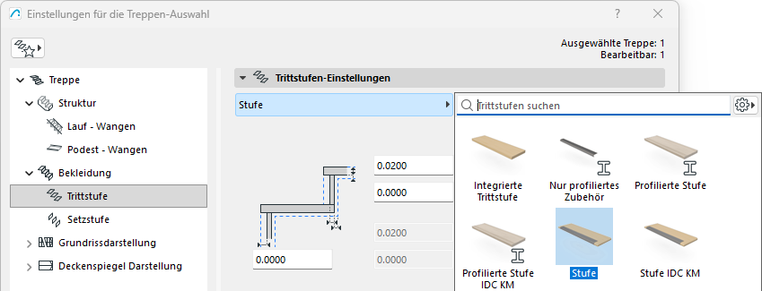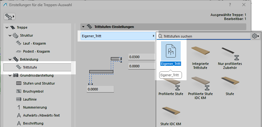 Erstellen Sie eigene Tritt-/Setzstufen nur dann, wenn diese auf der gesamten Treppe dieselbe Geometrie haben. Wenn die Treppe gerade Läufe und Podeste / gewendelte Tritte beinhaltet, verwenden Sie die vordefinierten Tritte!