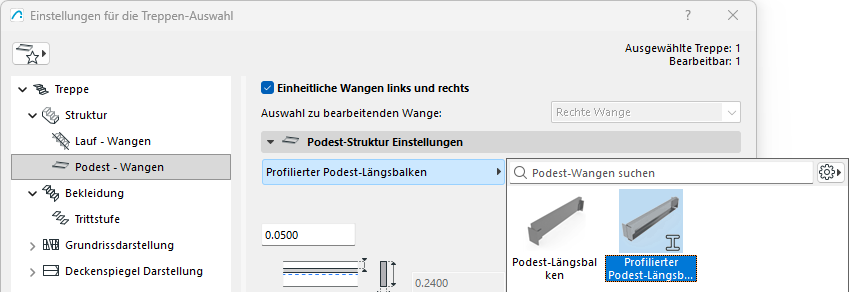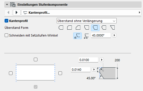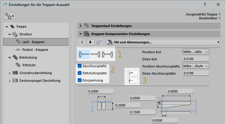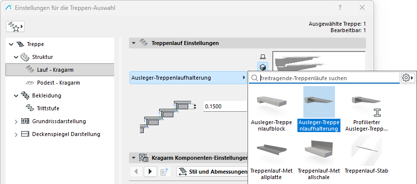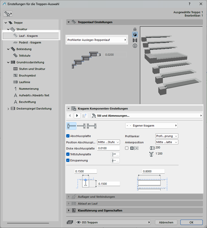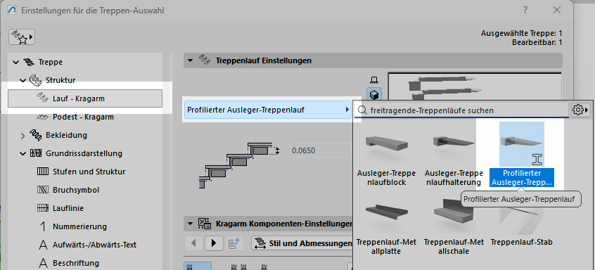 • Wählen Sie unter Treppenlauf Einstellungen den Profilierten Ausleger-Treppenlauf.