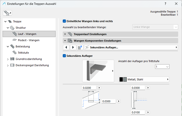 1. Kopieren Sie die Treppe, setzen Sie sie ein Geschoss tiefer (Tastaturkürzel Ctrl/Cmd+5) ein und machen Sie folgende Einstellungen: