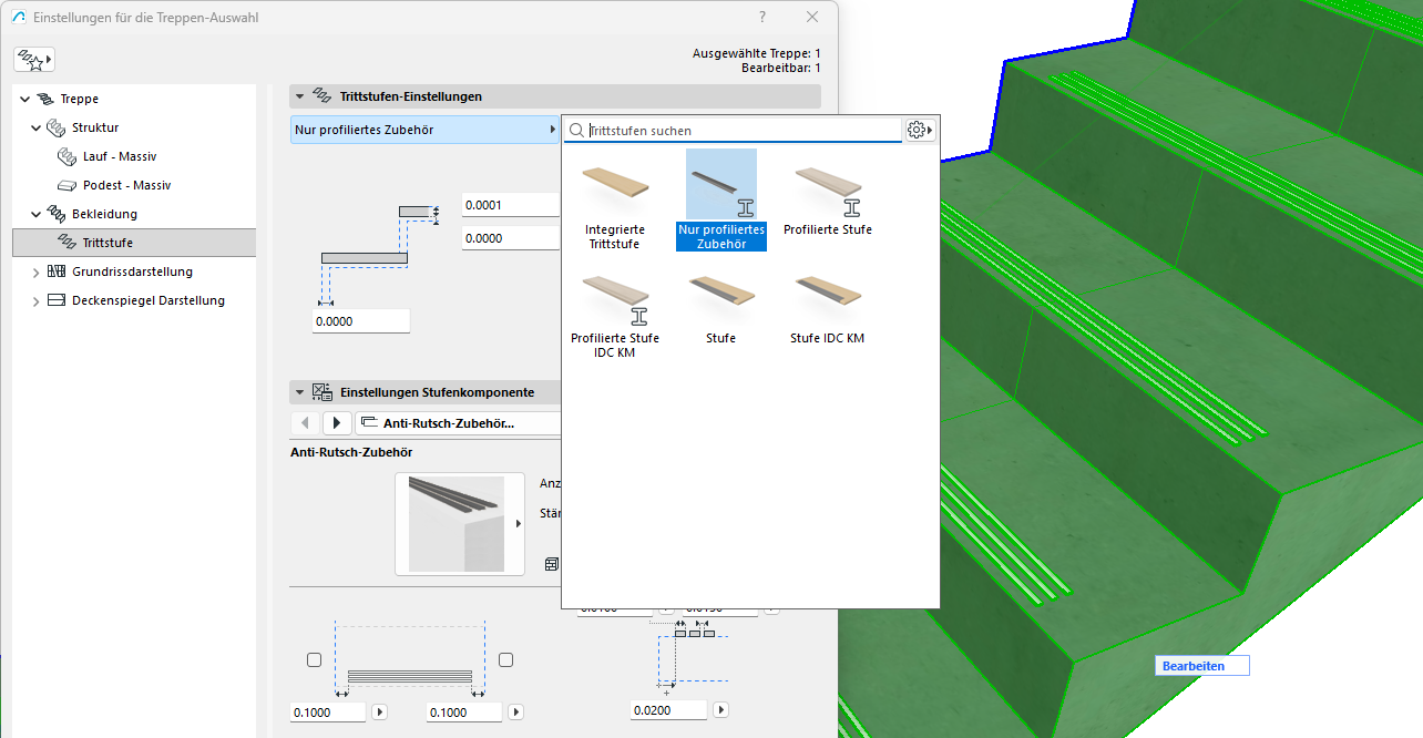 7. Gehen Sie dann in die Treppen-Grundeinstellung, um alle Tritte zu bearbeiten. Um nur einzelne Tritte zu bearbeiten, öffnen Sie den Bearbeiten-Modus der Treppe und aktivieren nur einzelne Tritte.