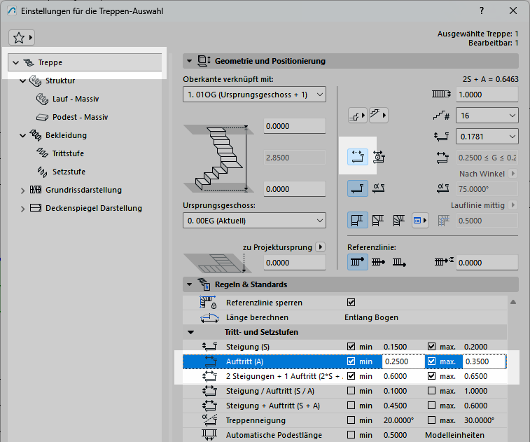 Definieren Sie die Laufbreite, Steigungen, Steigungshöhe, Auftrittlänge, Anzug, Lauflinie, Wendungstyp und Referenzline