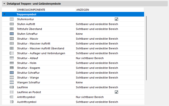 Für die Linien- und Schraffurtypen klappen Sie das Menü Grundrissdarstellung auf. Nehmen Sie dann entsprechende Einstellungen für die verschiedenen Bestandteile des Treppensymbols vor: