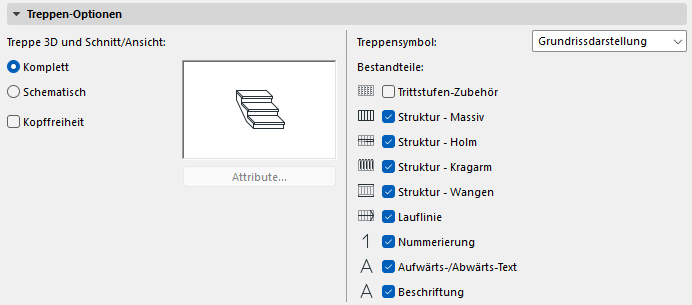 Steuern Sie die Darstellung des Treppensymbols grundsätzlich über die Modelldarstellung. Dies erlaubt einfache Anpassungen über das ganze Modell für alle gesetzten Treppen gleichzeitig. Im Menü Treppen-Optionen können folgende Elemente des Grundrisssymbols ein-/ausgeschaltet werden.