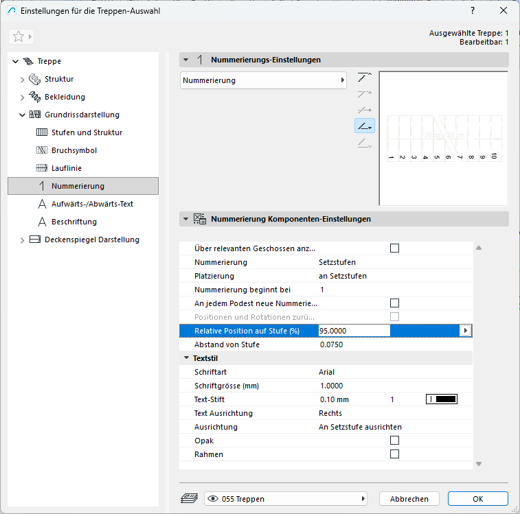 Beschriftungen und Nummerierungen können pro Treppe individuell angepasst werden. Folgend werden einige wichtige Einstellungen beschrieben.