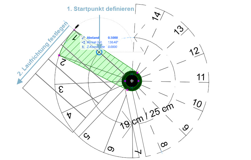 • Hilfslauflinie: Es wird eine zweite Lauflinie konstruiert, 20 cm von der inneren Ecke.