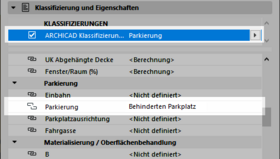 Jeder Parkplatz muss separat als Raum (IfcSpace) modelliert und informiert werden. Die Räume können mit einer fiktiven Höhe definiert werden. Die Klassifikation in Solibri unterscheidet die verschiedenen Parkplatztypen bei IFC4 über die dafür vorgesehene Eigenschaft ParkingUse (siehe Modellplan).