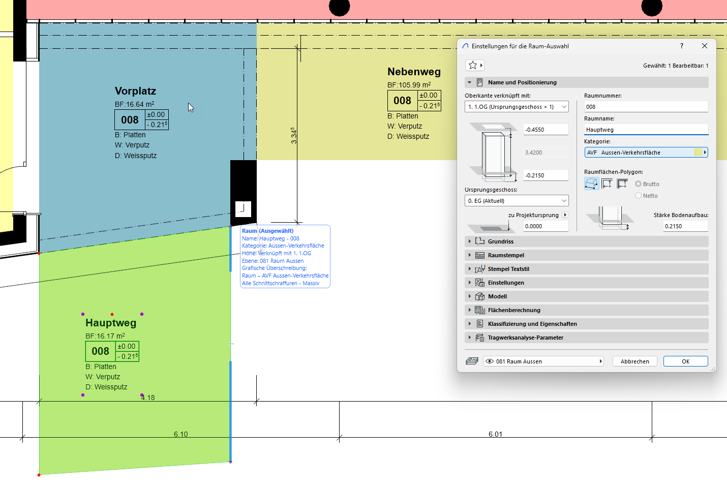 Zudem muss ein Raum definiert werden, der den Vorraum des Hauseingangs definiert. Dieser wird benötigt, um sicherzustellen, dass auf diesem Vorplatz mit einem Rollstuhl manövriert werden kann. Den Vorplatz können Sie ebenfalls anhand des Raumnamens definieren. Verwenden Sie folgenden Raumnamen, um einen Vorplatz zu definieren: