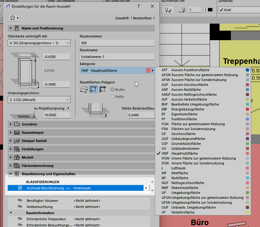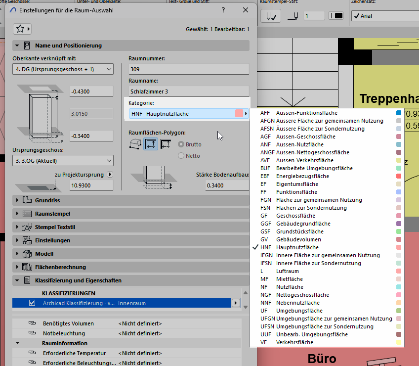 Damit Räume nach SIA 416 klassifiziert werden können, benötigen sie in den Raumeinstellungen unter Kategorien einen Wert.