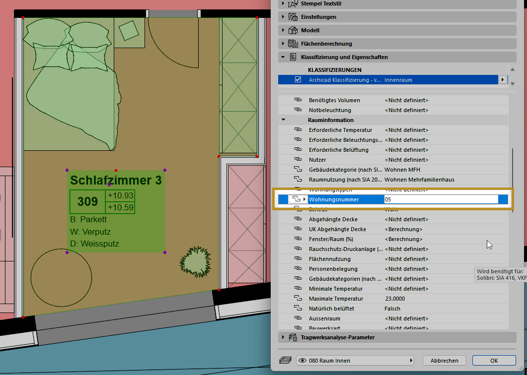 Räume werden in Solibri auch in der Klassifikation CHE_SIA 416 klassifiziert.