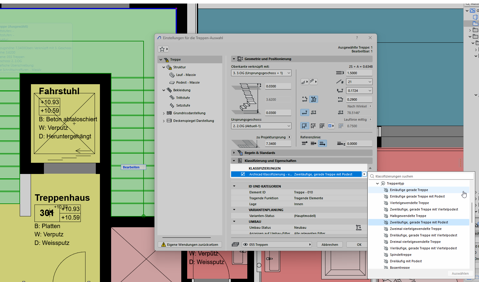 1. Wählen Sie unter der ArchiCAD-Klassifizierung - v2.0 aus, um welche Art von Treppe es sich handelt. Es ist relevant, ob es sich um eine gerade Treppe handelt oder um eine andere Art von Treppe. Wenn es sich um eine gerade Treppe handelt, wählen Sie einen entsprechenden Klassifizierungsnamen.