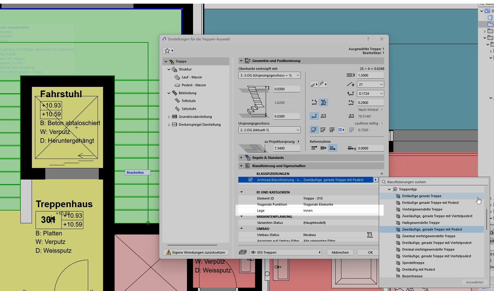 2. Bei Treppen muss in der Eigenschaft Lage auch angegeben werden, ob es sich um eine Außen- oder Innentreppe handelt. Geben Sie auch hier den entsprechenden Wert ein.