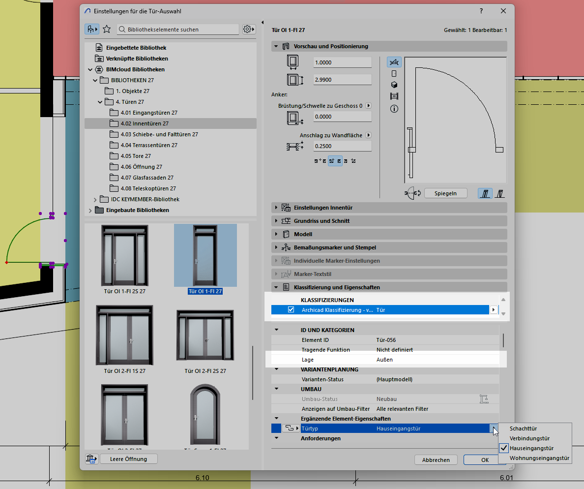 2. Bei Türen wird ausserdem in der Eigenschaft Lage die Angabe benötigt, ob es sich um eine Aussen- oder Innentür handelt.